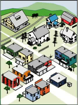 flat-roofed houses, small town buildings or houses